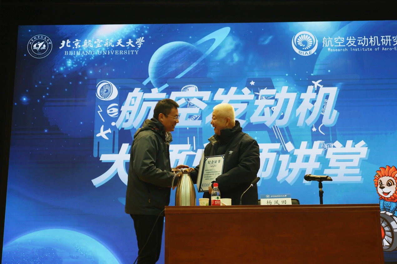 随后,航发院党委书记袁星为杨院士颁发航空发动机大师总师讲堂主讲人纪念证书。