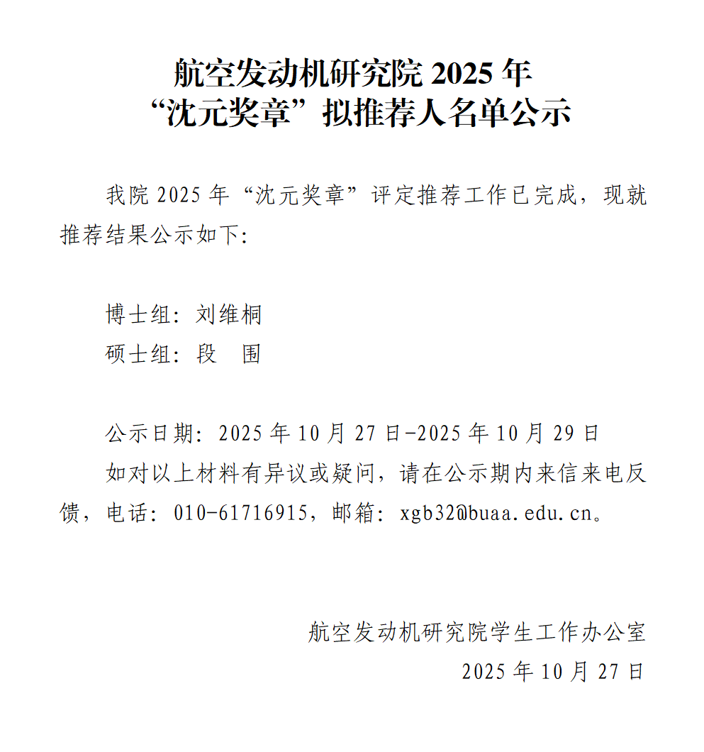 航空发动机研究院2025年11月北航优秀毕业生申请材料公示