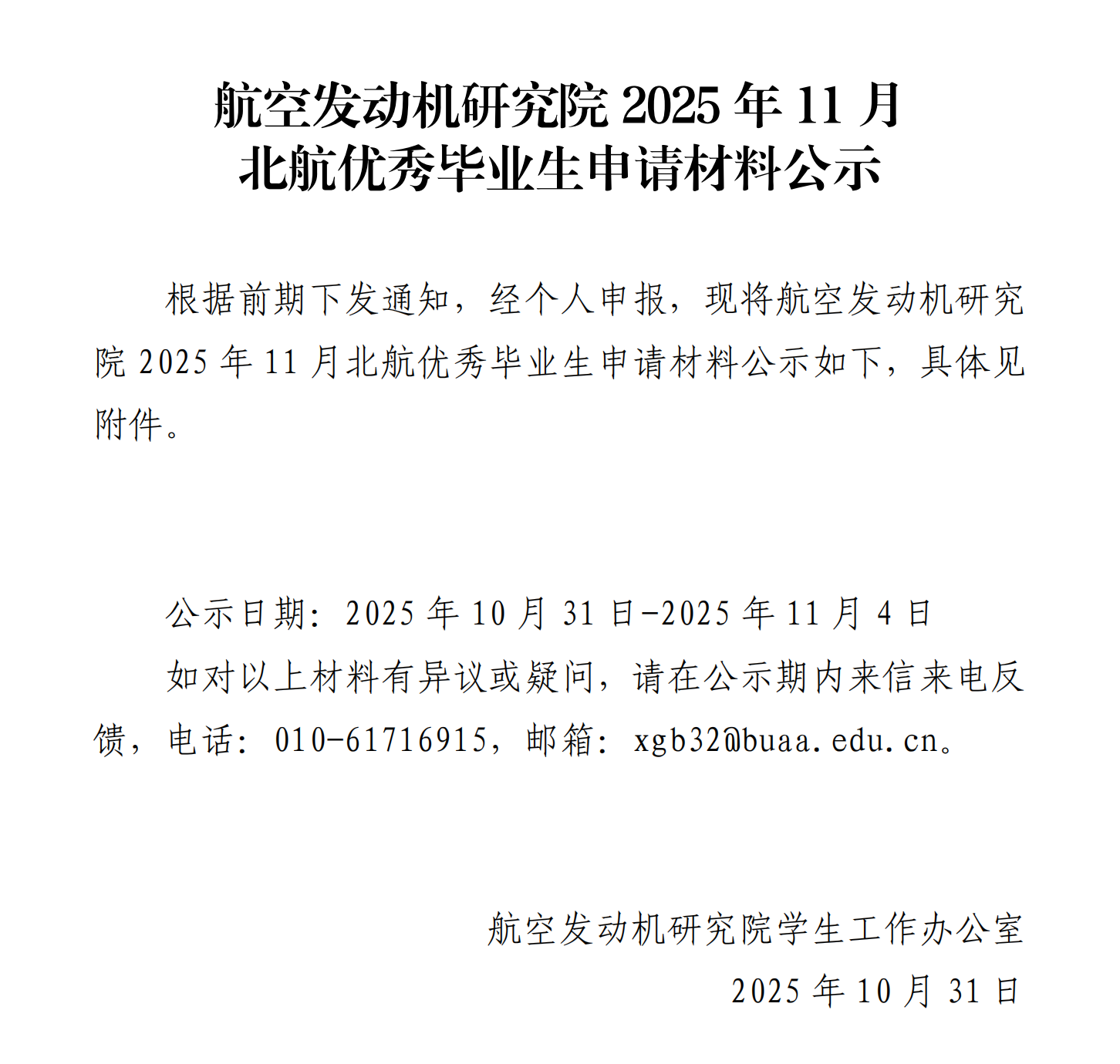 航空发动机研究院2025年11月北航优秀毕业生申请材料公示